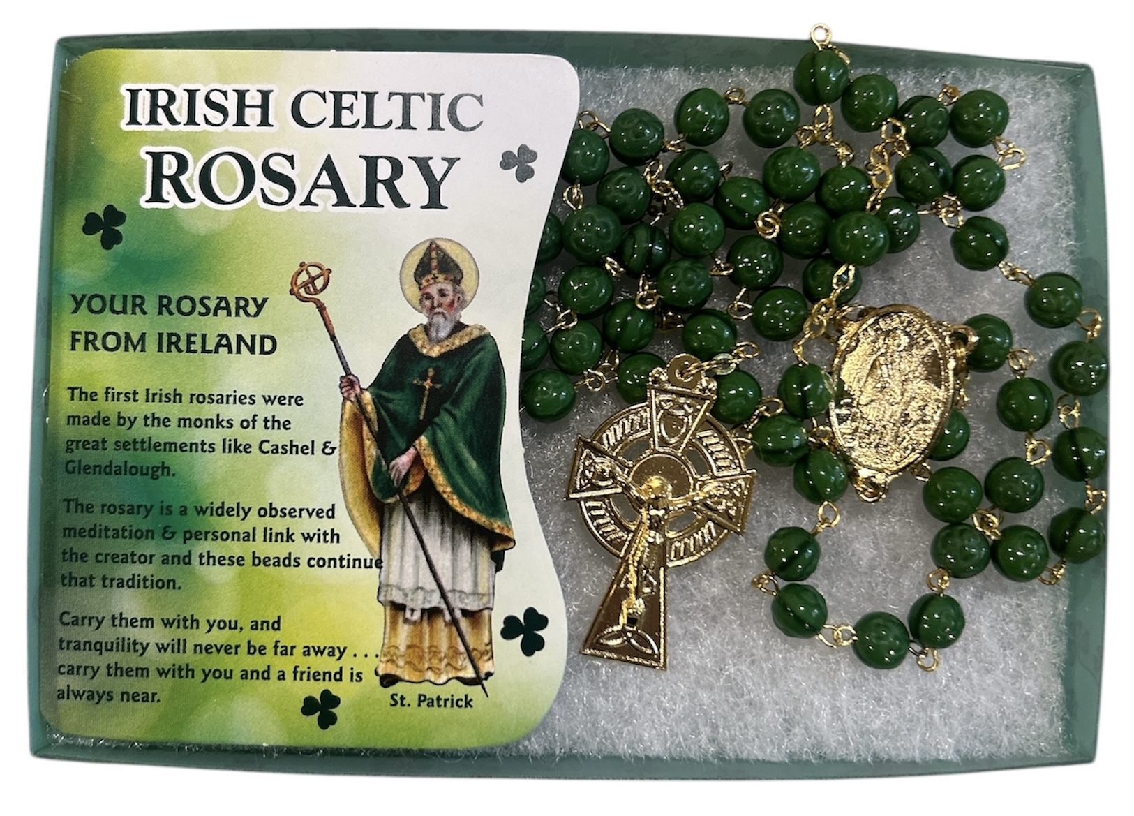 Each rosary holds a very special meaning both to us and the receiver. These green glass beads continue that tradition with a traditional Celtic cross and an image of Saint Patrick gracing the center of this timeless rosary.