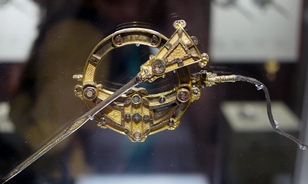 Dated to the late 7th or early 8th century the famous Tara Brooch , now housed in the National Museum of Ireland,Dublin , was discovered buried in a box, by a woman on the beach at Bettystown, Co. Meath in 1850. As a high-status item, it was used to fasten a cloak and likely indicated the wearer’s wealth and prestige. The brooch is decorated on both sides with exceptionally fine gold filigree panels depicting animal and abstract motifs. It represents the pinnacle of Irish metalworking techniques.