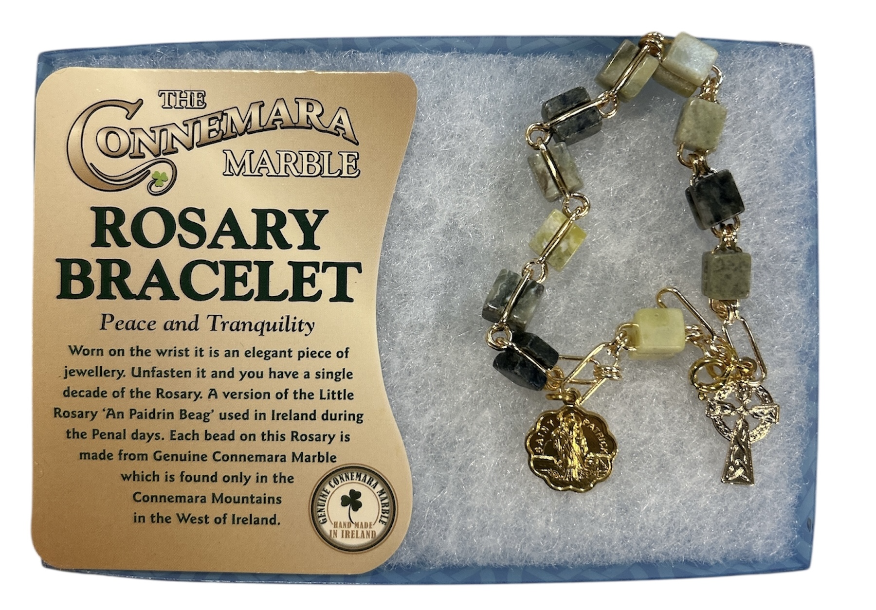 This beautifully crafted Rosary Bracelet is made from Connemara Marble beads on a gold tone chain.